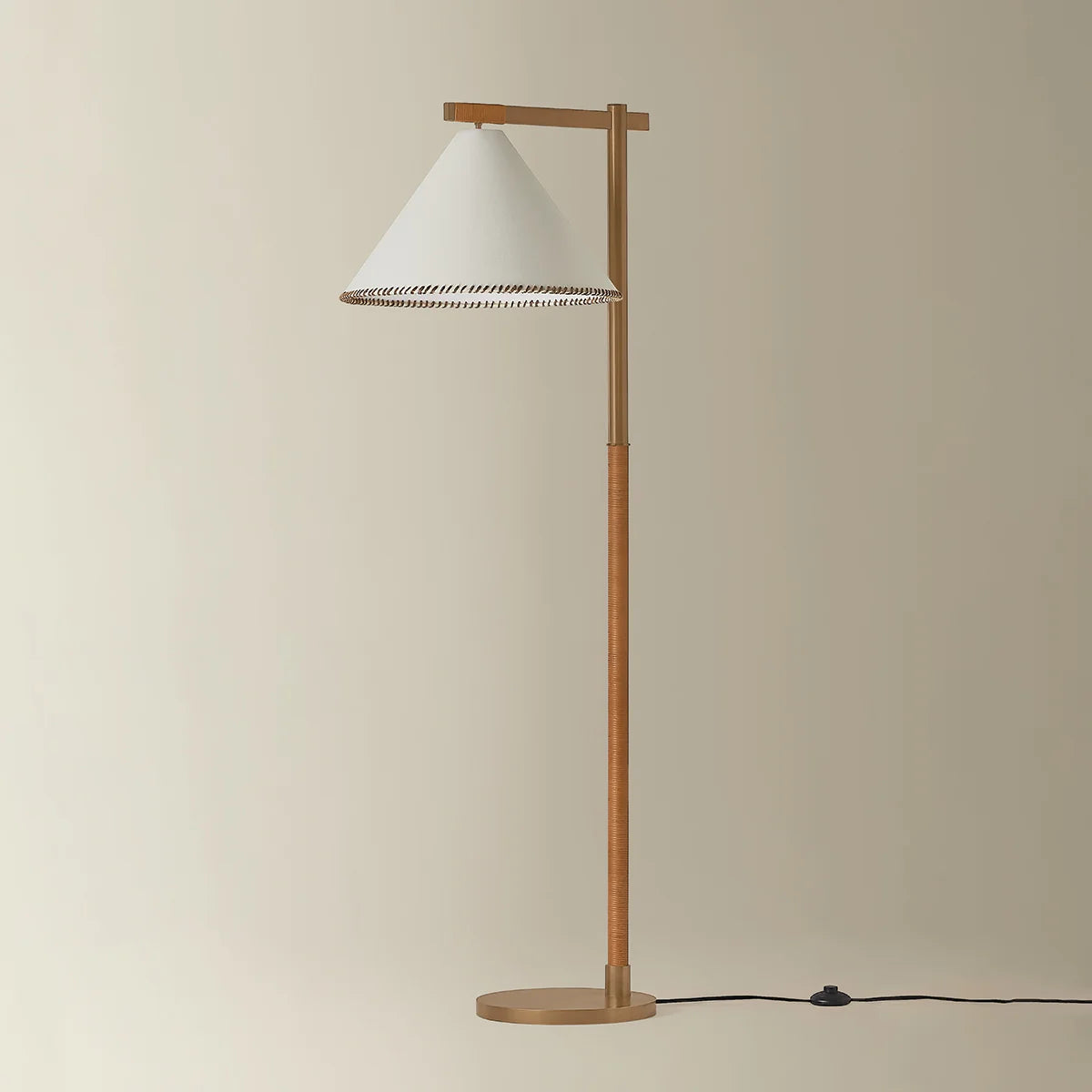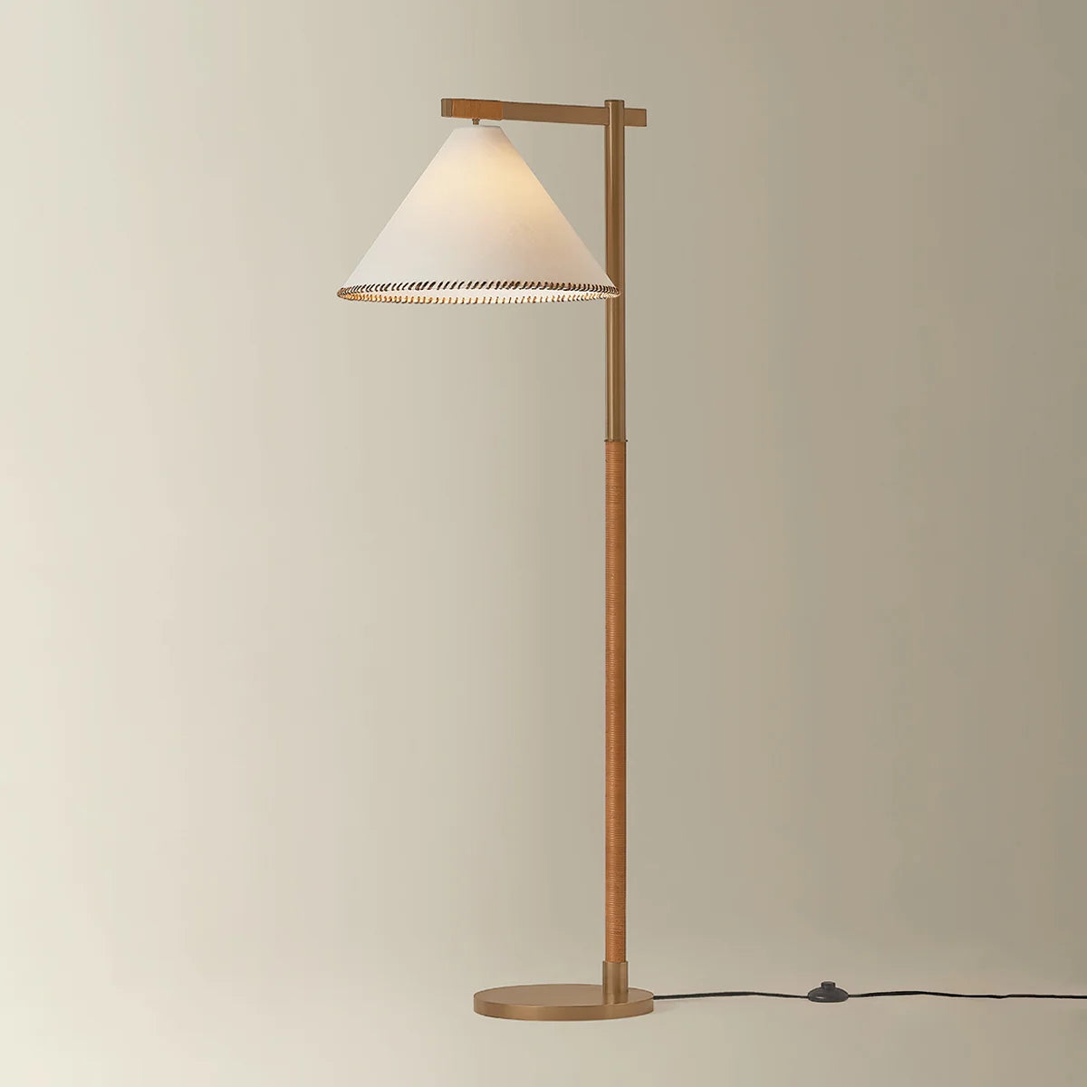 The architectural design language of the Stoney family is softened by its unique material qualities. Large conical white linen shades are edged with contrasting whip-stitching, echoing the natural jute wrap details along the Patina Brass frames. Available as a 1-light sconce, 1-light pendant, 5-light chandelier, and 1-light floor lamp, Stoney is an ode to craftsmanship.