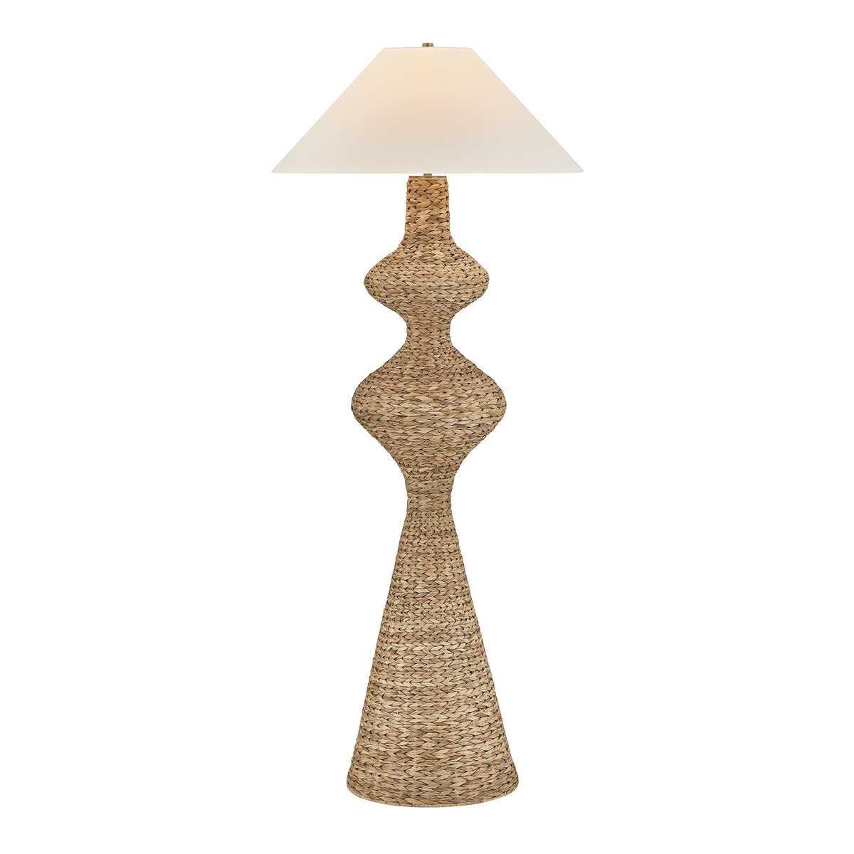 Equally bold as it is inviting, the Walter floor lamp pairs dimensional forms with organic textures. Woven entirely from water hyacinth, the elongated silhouette flows with rippling curves. A wide conical shade in soft off-white linen adds balance to the shape, while the Patina Brass fittings contribute to the earthy tonality of the lamp.