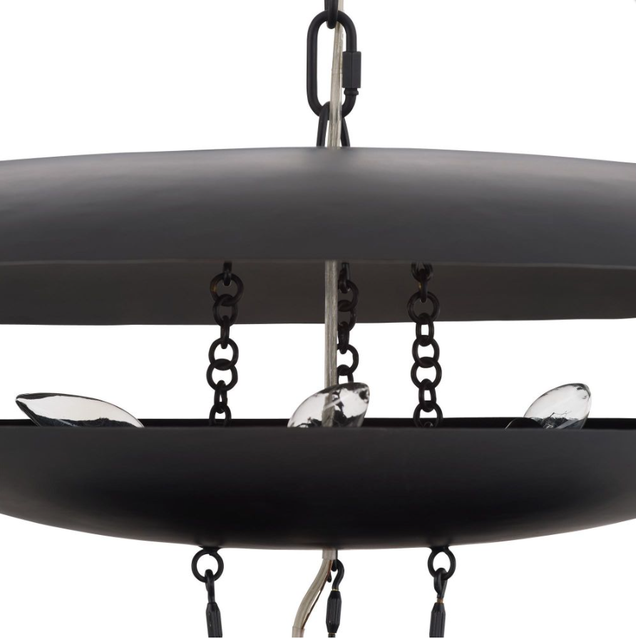 A hospitality-ready chandelier with eight lights and floating curved discs beneath a space-inspired dome. Available in gold-leafed or blackened iron finishes, both create a soft, ambient glow from two levels of lighting. Damp-rated for indoor use. Additional chain available (CHN-123).
