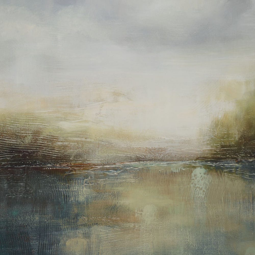 Immerse yourself in a serene landscape depicting a moody blue lake, elegantly presented within an aged walnut frame and highlighted by a crisp white linen liner. Perfect for adding a touch of tranquility to any space. Artwork by Simon Addyman.