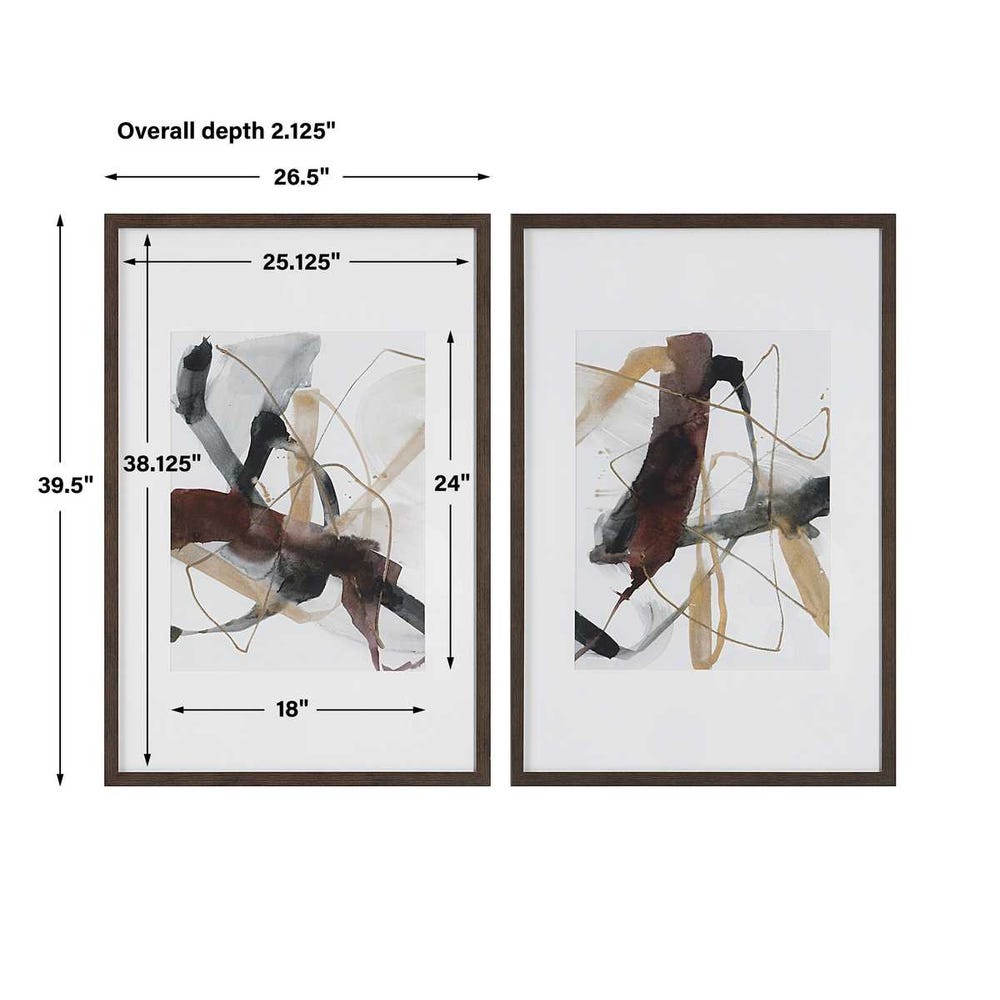This abstract artwork displays a harmonious blend of neutral brushstrokes in gray, black, and warm chestnut tones. Each print is accented by a white mat under glass with a dark walnut finished frame. May be hung horizontal or vertical. Artwork by Jennifer Goldberger.
