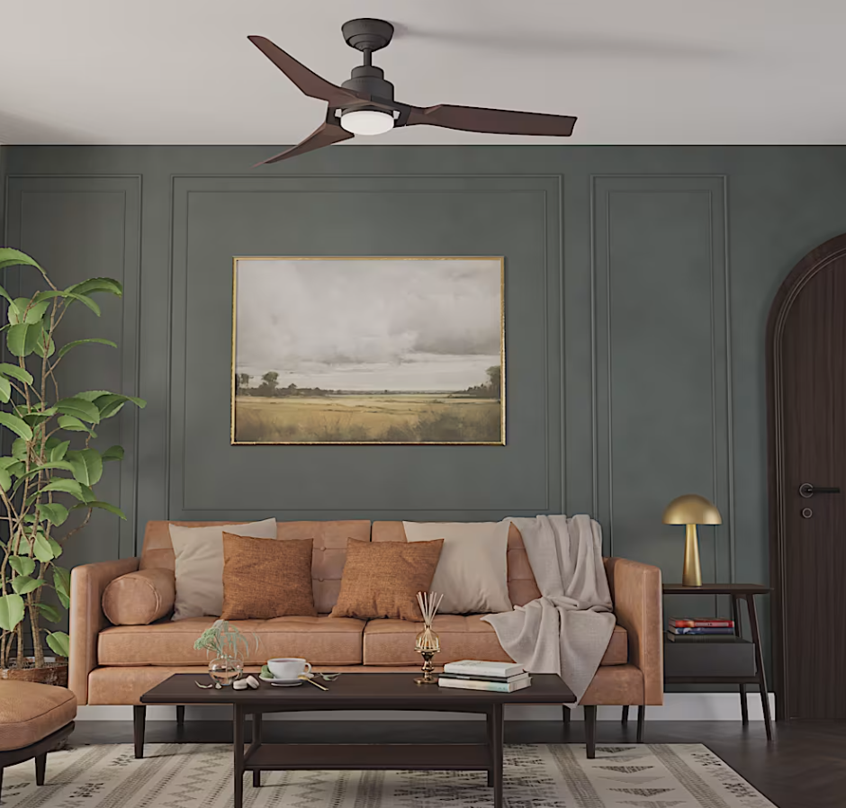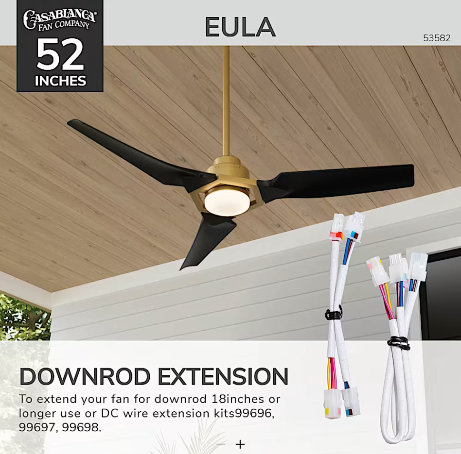 The Hunter Eula 52" Outdoor Ceiling Fan delivers powerful, efficient cooling with a relaxed, stylish design. ENERGY STAR® certified and 64% more efficient, it features SureSpeed® airflow and a quiet 6-speed Eco Whisper DC motor—perfect for covered patios and porches. Damp-rated for durability, it includes a 20W LED light, handheld remote, and a No Light Cap for a cleaner look when preferred. Downrods and Slope Adapters included ONLY with Matte Black - Chestnut Fan