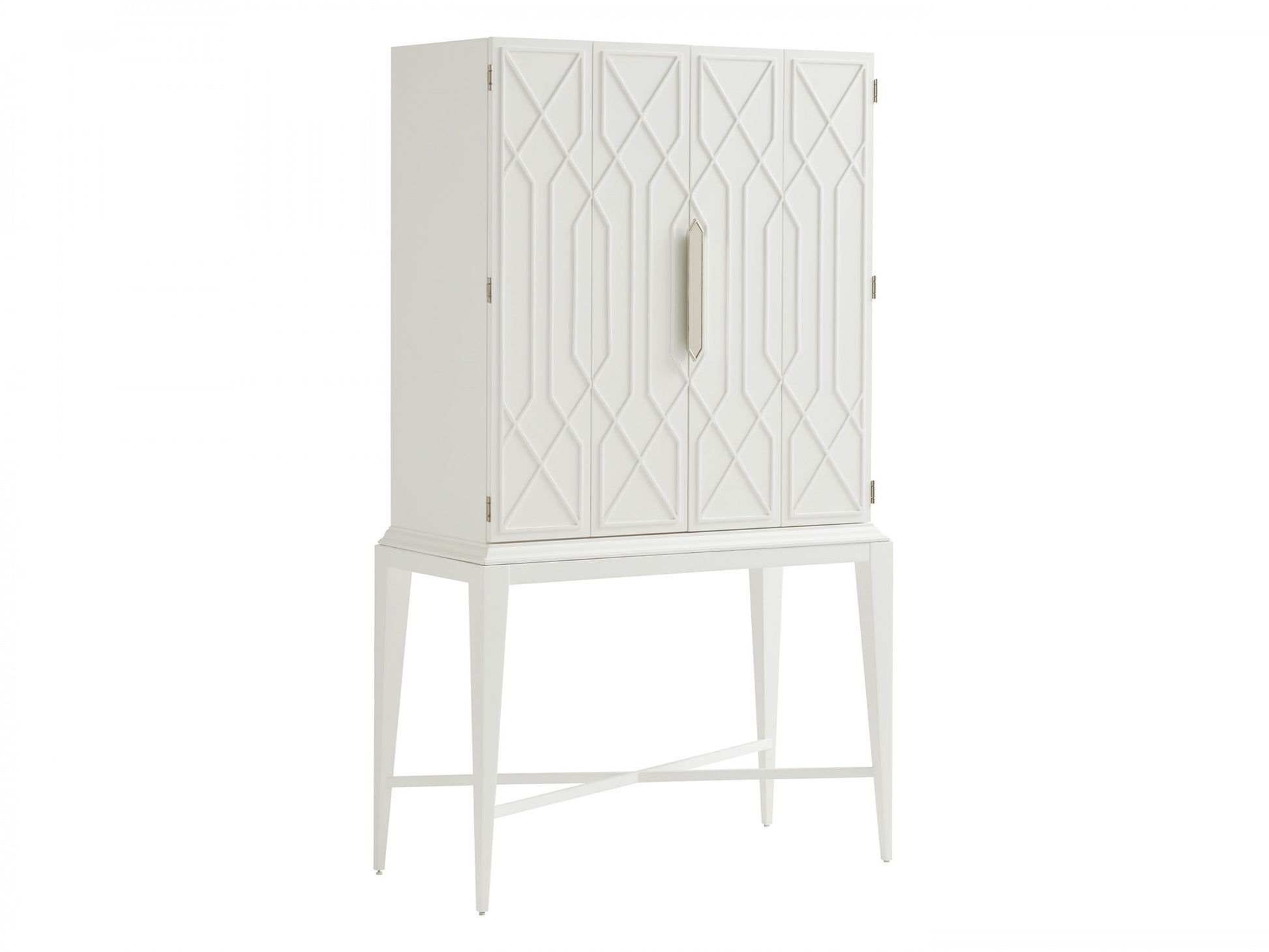 The Elmhurst bar is another signature design in the collection. Transitional geometric fretwork on the bifold doors frames a piece of statement hardware in polished nickel. Behind the doors are a mirrored back panel, three adjustable glass shelves, a mirrored stationary shelf, two storage drawers, and a pull-out serving shelf. The piece features touch LED lighting with a dimmer switch.