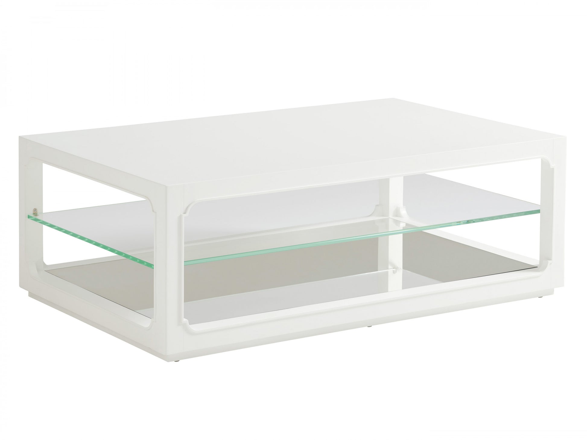 The Glenwood cocktail table offer a clean transitional look, with a stationary glass shelf, mirrored bottom shelf and plinth base.