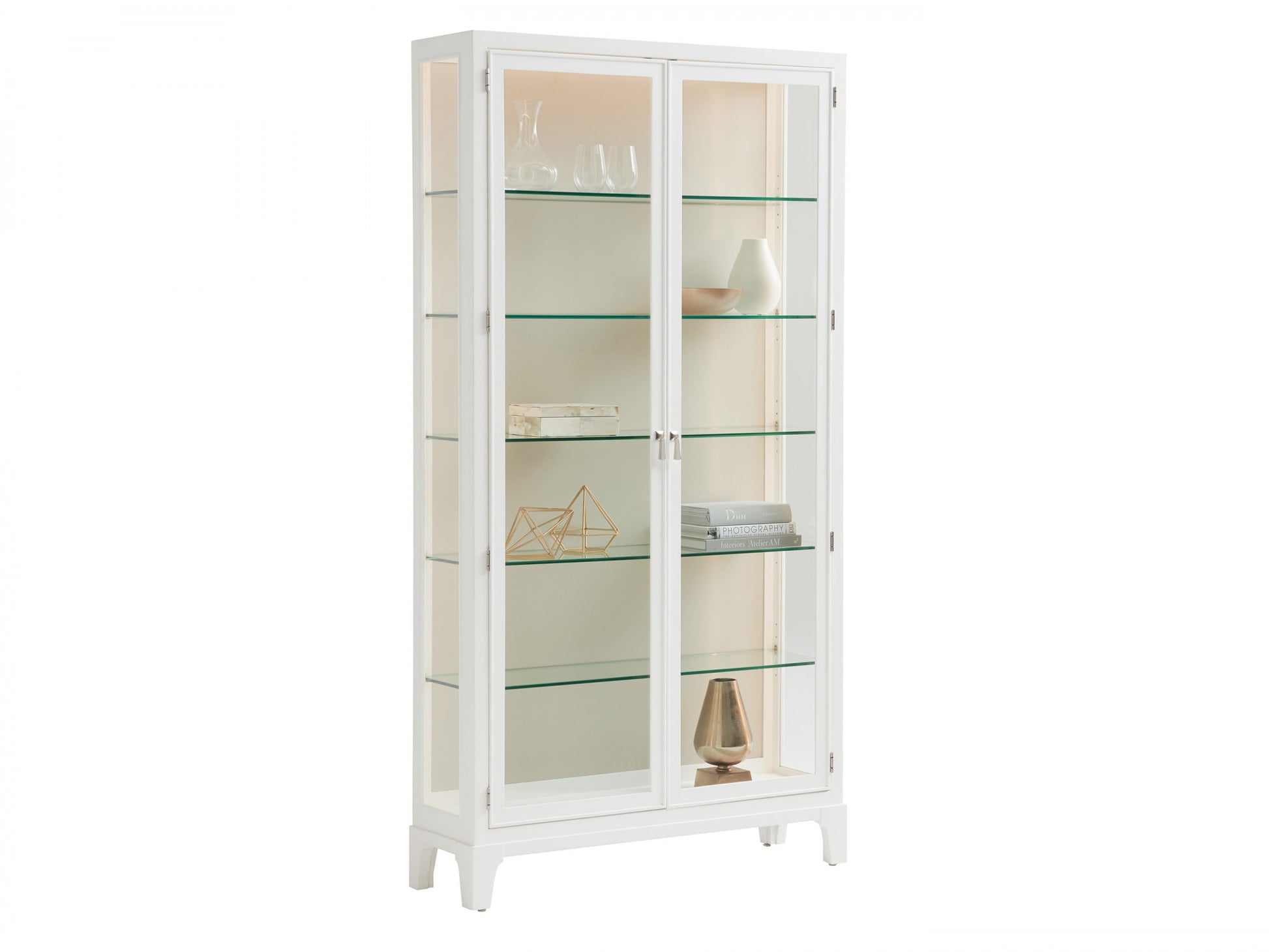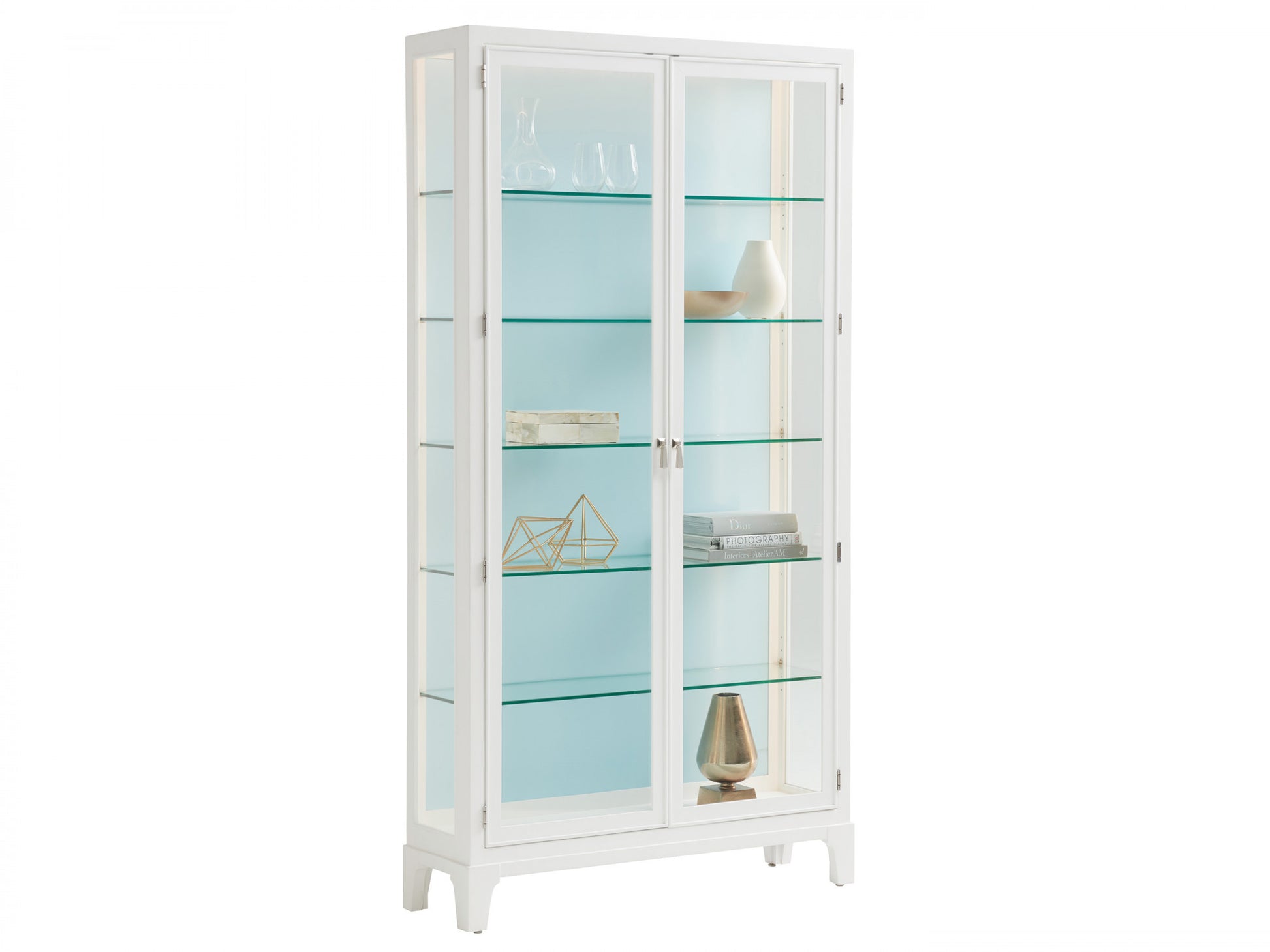 Scaled at 49-inches wide and 92-inches tall, the Lakeshore curio makes a significant design statement as a single unit or in pairs. The piece has tempered glass doors, glass end panels, and five adjustable tempered glass shelves. Dimmable touch LED lighting strips on the sides of the piece serve to highlight the contents behind the glass, making it the perfect anchor item for any room. The Lakeshore curio comes standard with an Alabaster white back panel as a 415-864. Two contrasting color back panels are also available as an option with the curio. For the soft sky-blue back panel, the item number is 415-864LB. For the taupe back panel, the item number is 415-864TP. This flexibility offers the opportunity to customize the look of the piece.