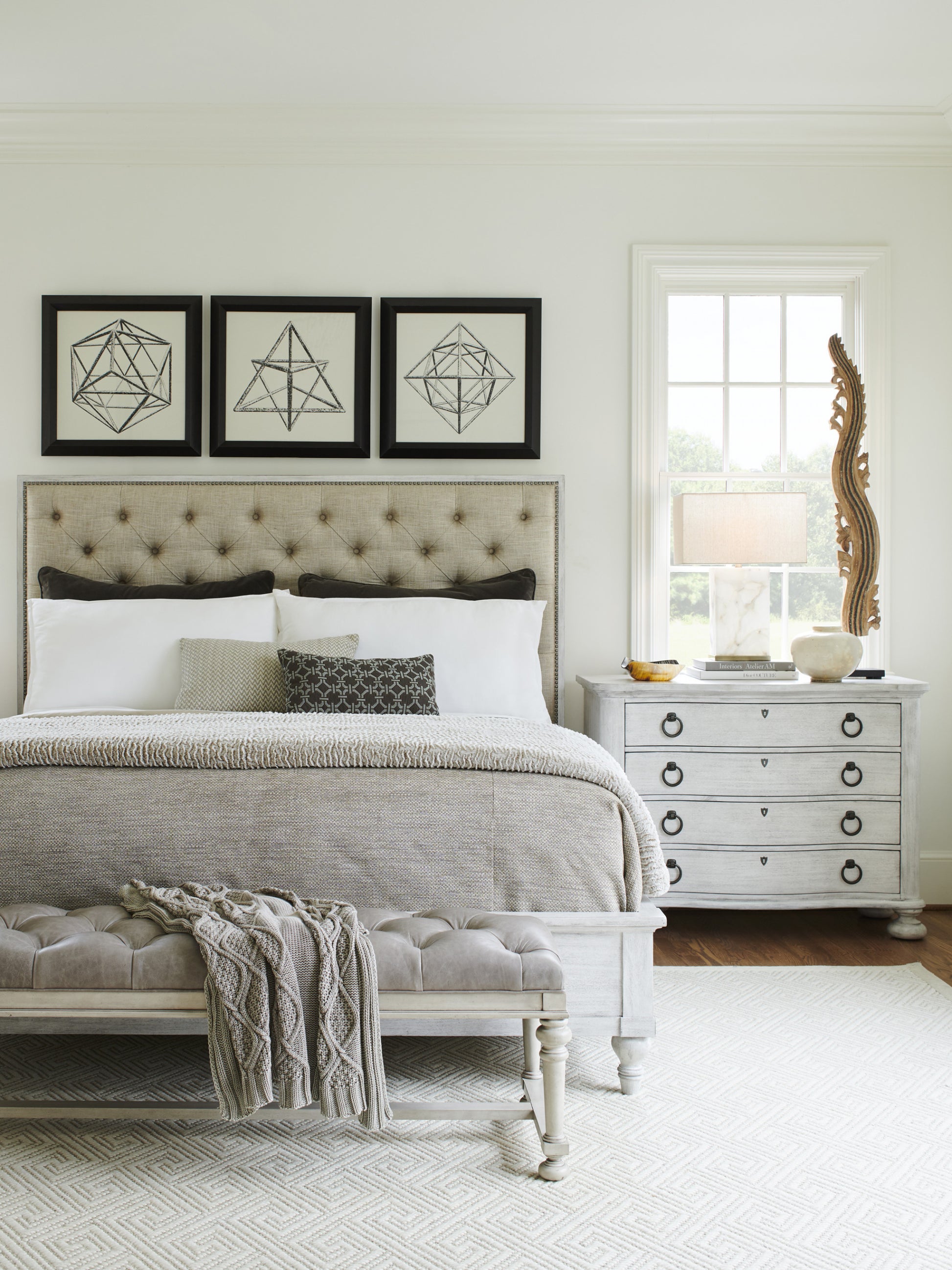The 48-inch chest, with a soft serpentine front, decorative ring pulls and turned legs, offers a dramatic nightstand option for the master bedroom.