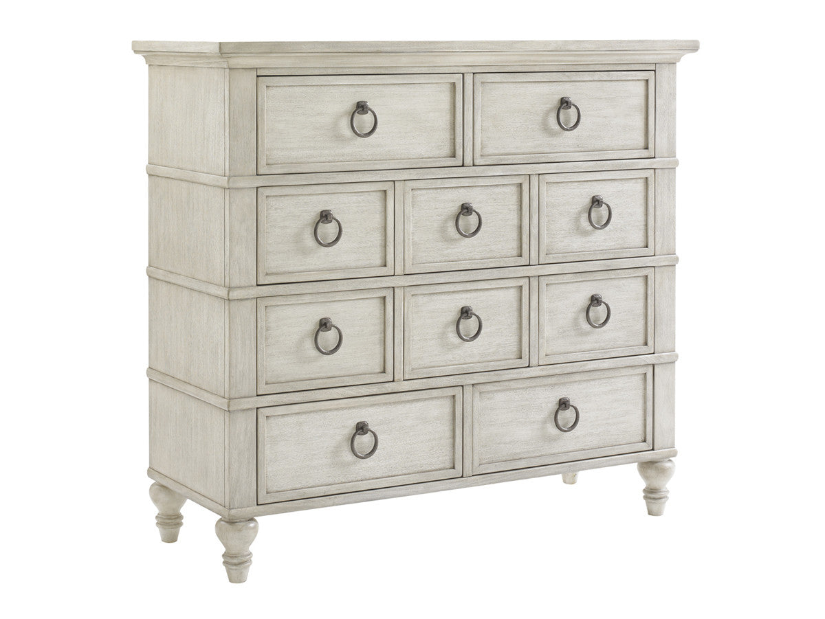 Decorative ring pulls turned feet, and ten drawers create a stylish, yet functional dresser.