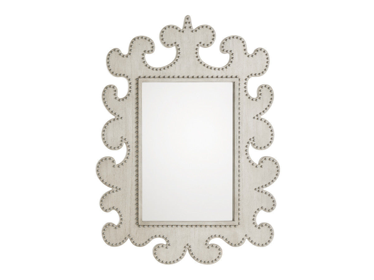 Make a design statement with this vertical mirror, which features poignant cutouts and a striking pattern of nailhead trim.