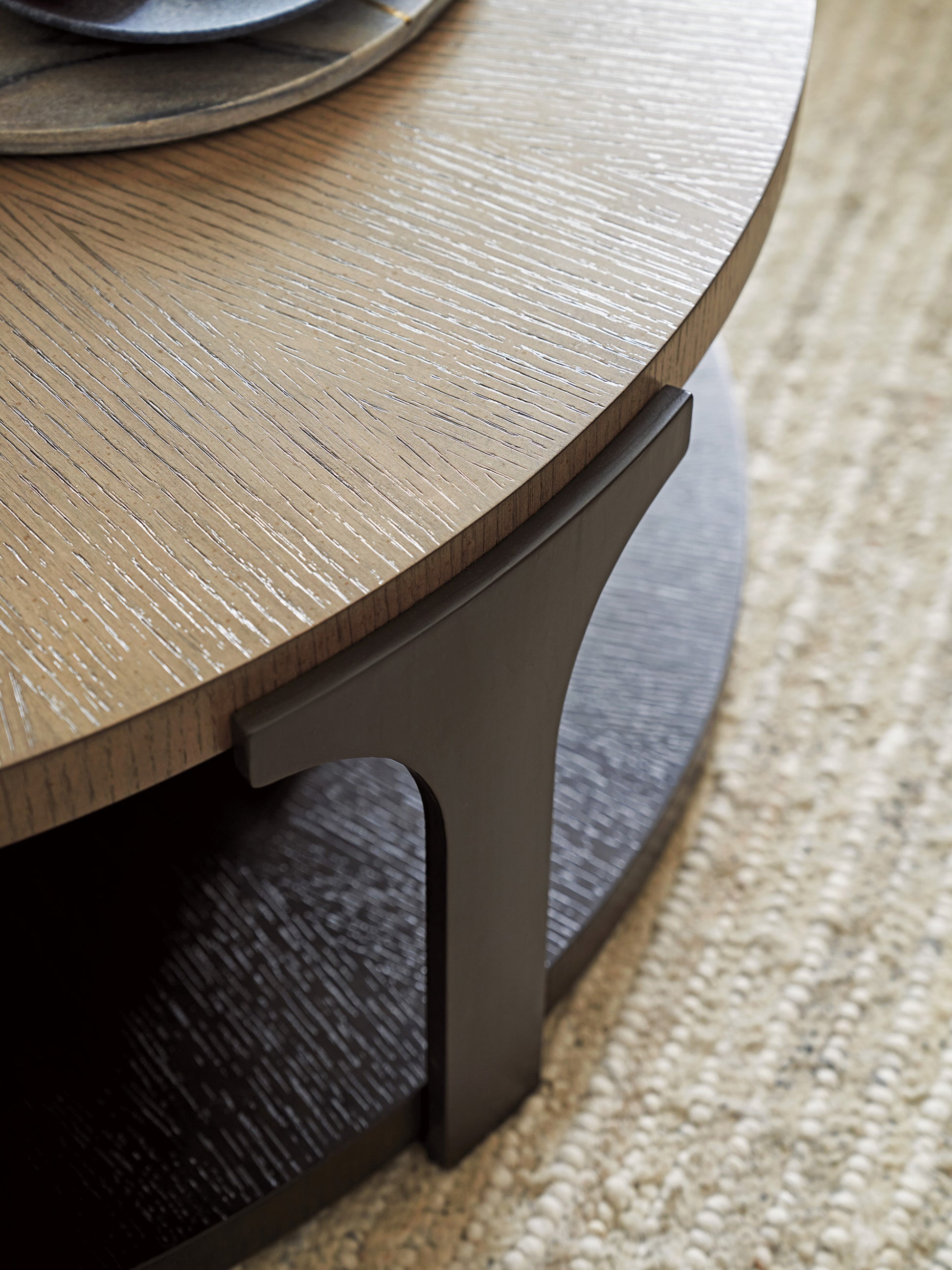 The Kenya cocktail table features a radial veneer pattern on the top, a base in the dark Tunis finish and custom flared metal supports.