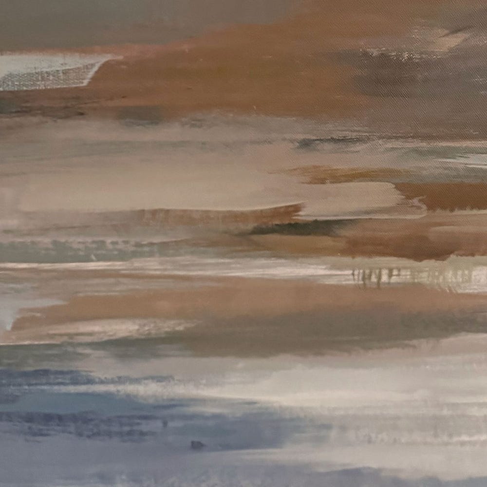Lowlands framed canvas displays an abstract landscape in a palette of grays, blues, and warm browns. A double gallery frame, in white and gray washed wood, encases the artwork. Each canvas is proudly handcrafted and printed in the USA. Artwork by Liz Jardine.