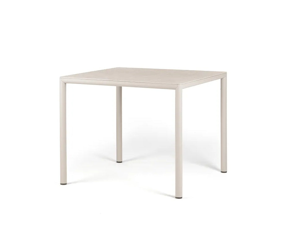 Piave is a table system that combines visual lightness and formal balance with functionality: a very thin textured laminate top, rounded corners and a sturdy aluminum frame with a round cross section.