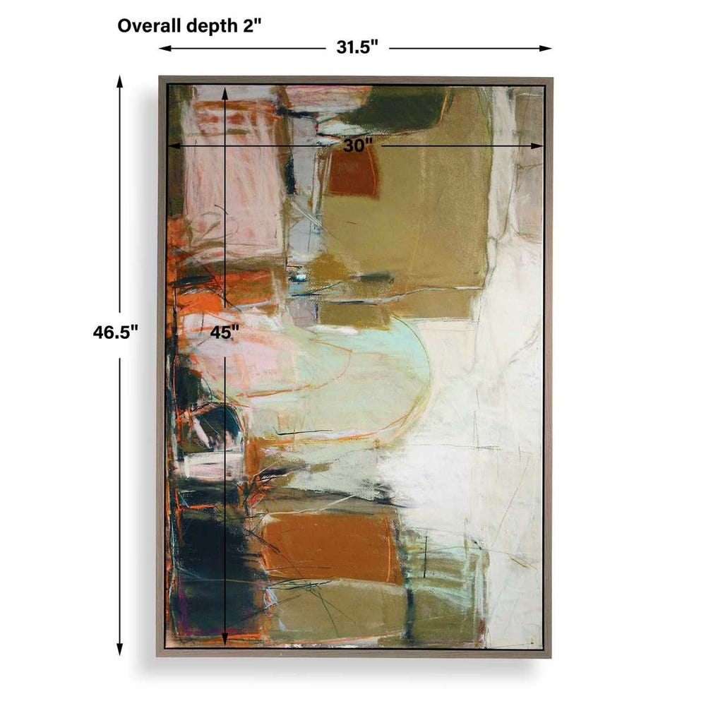 Palace Walls emits playful energy through geometric and organic shapes in a rich palette of earthy tones, including deep olive greens, warm golds, and soft, muted peaches. Splashes of pale sky blue and bright orange lines cut through the forms, adding depth and visual interest. A gallery frame with a light oak finish completes the artwork. May be hung horizontal or vertical. Each canvas is proudly handcrafted and printed in the USA. Artwork by Jeannette Hayes.