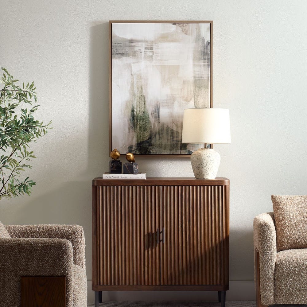 Tones of brown, green, and gray brushstrokes mix together to create a richly textured work that adds a sophisticated, natural touch. A gallery frame with a light oak finish completes the artwork. May be hung horizontal or vertical. Each canvas is proudly handcrafted and printed in the USA. Artwork by Gemma Bardot.