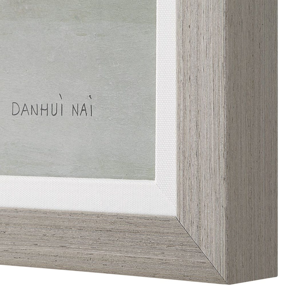 Capturing the serene beauty of shorebirds on the coast, this print showcases soft tones of blue, green and beige. Its delicate balance of colors makes it an ideal complement to coastal-inspired interiors. This piece is accented by a light gray wood toned frame with a linen liner, placed under a protective glass. Artwork by Danhui Nai.